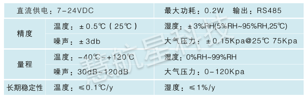 慧航星HHXWSY-100溫濕壓變送器可廣泛適用于環(huán)境監測,集噪聲(可選)、溫濕度、大氣壓力采集于一體,設備采用標準MODBUS-RTU通信協(xié)議,RS485信號輸出,通信距離最大可達2000米。采用一款高度集成的溫濕度傳感器芯片,芯片全量程標定的數字輸出。采用專(zhuān)利的CMOSens技術(shù),確保產(chǎn)品具有極高的可靠性與卓越的長(cháng)期穩定性。每個(gè)傳感器芯片都在極為精確的恒溫室中進(jìn)行標定,以鏡面冷凝式露點(diǎn)儀為參照。通過(guò)標定得到的校準系數以程序形式儲存在芯片本身的OTP內存中。通過(guò)兩線(xiàn)制的串行接口與內部的電壓調整,使外圍系統集成變得快速而簡(jiǎn)單。