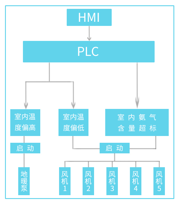 系統原理圖如下:生豬養殖自動(dòng)化控制系統運行原理:通過(guò)慧航星PLC連接的外部溫濕度傳感器實(shí)時(shí)反饋回來(lái)的數值,監測生豬生長(cháng)環(huán)境是否處于最優(yōu),當PLC檢測到外部生豬生長(cháng)環(huán)境溫度過(guò)高,或者室內氨氮含量過(guò)高時(shí),慧航星PLC會(huì )控制相應風(fēng)機啟動(dòng),加快室內空氣流通,從而達到降溫的目的;慧航星PLC在監測到的實(shí)際溫度超過(guò)適合生豬生長(cháng)的環(huán)境溫度的同時(shí),慧航星PLC會(huì )控制對應水簾的電機轉動(dòng),快速產(chǎn)生大量水霧,從而達到降溫的目的;當生豬生長(cháng)的環(huán)境溫度過(guò)低時(shí),慧航星PLC可以通過(guò)控制地暖泵將熱水循環(huán)供應到地暖水管中,從而達到升高室內溫度的目的。通過(guò)慧航星人機界面,能夠遠程監控并顯示生豬養殖環(huán)境,實(shí)時(shí)觀(guān)察到室內生豬生長(cháng)環(huán)境的溫濕度、氨氮含量等相關(guān)參數,進(jìn)而可以了解到室內環(huán)境情況。當發(fā)現室內生豬生長(cháng)環(huán)境異常的時(shí)候,手動(dòng)模式下可以直接通過(guò)慧航星人機界面遠程操作,自動(dòng)模式下,PLC能夠直接通過(guò)更改風(fēng)機和水泵的運行狀態(tài)來(lái)改變室內生豬生長(cháng)環(huán)境,不需要人工步行到設備現場(chǎng)去手動(dòng)操作。